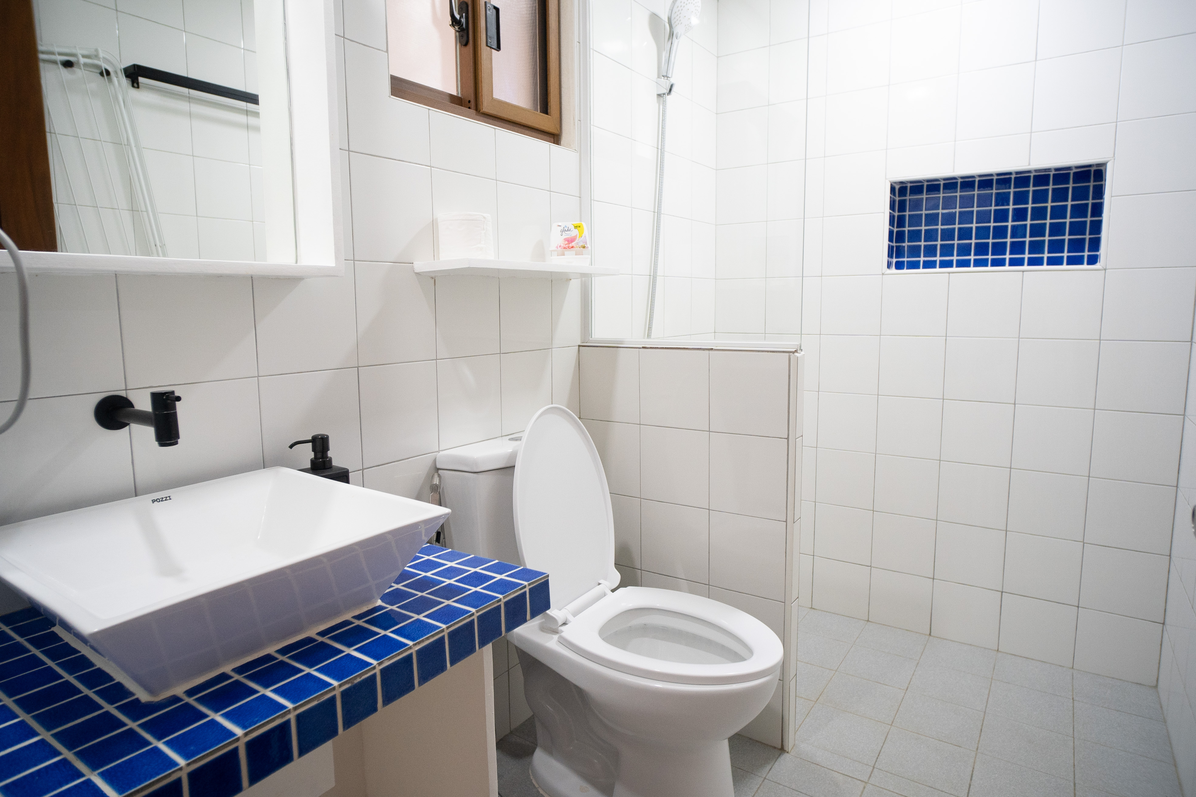 오션플레이어 보홀의 시그니쳐 색상 로열 블루로 준비된 쾌적한 화장실.